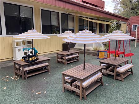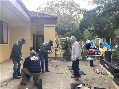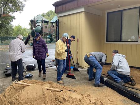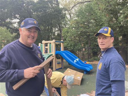 After clearing out the old play area, members of RCI installed a new playground and sandbox. Hard work, but the result should provide plenty of fun for the kids and their parents.